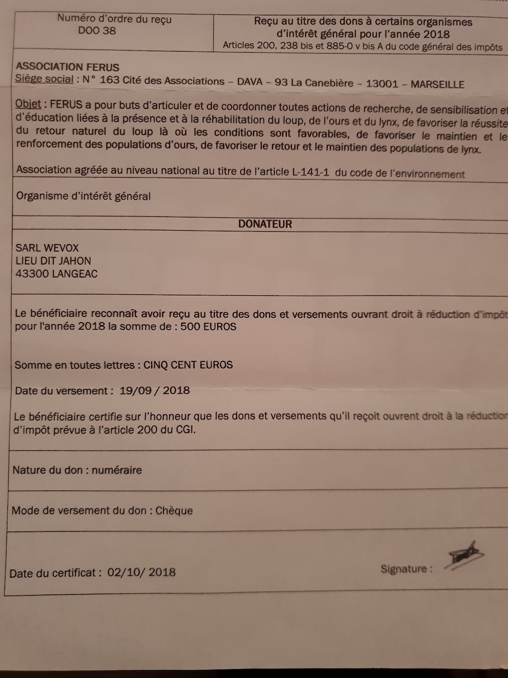 Par soucis de transparence avec nos utilisateurs, voici la preuve du don réalisé à l'association Ferus.